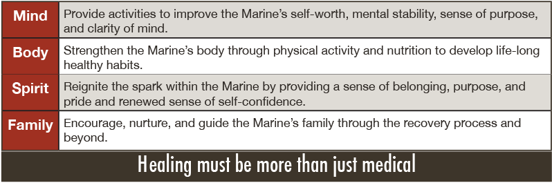 The Wounded Warrior Regiment approaches each individual Marine’s recovery as a relationship, not a process, and encourages healing in all aspects of life. To help Marines focus on the varying means through which they will overcome the challenges of their wound, illness, or injury, the WWR developed four separate lines of operation: Mind, Body, Spirit, and Family.