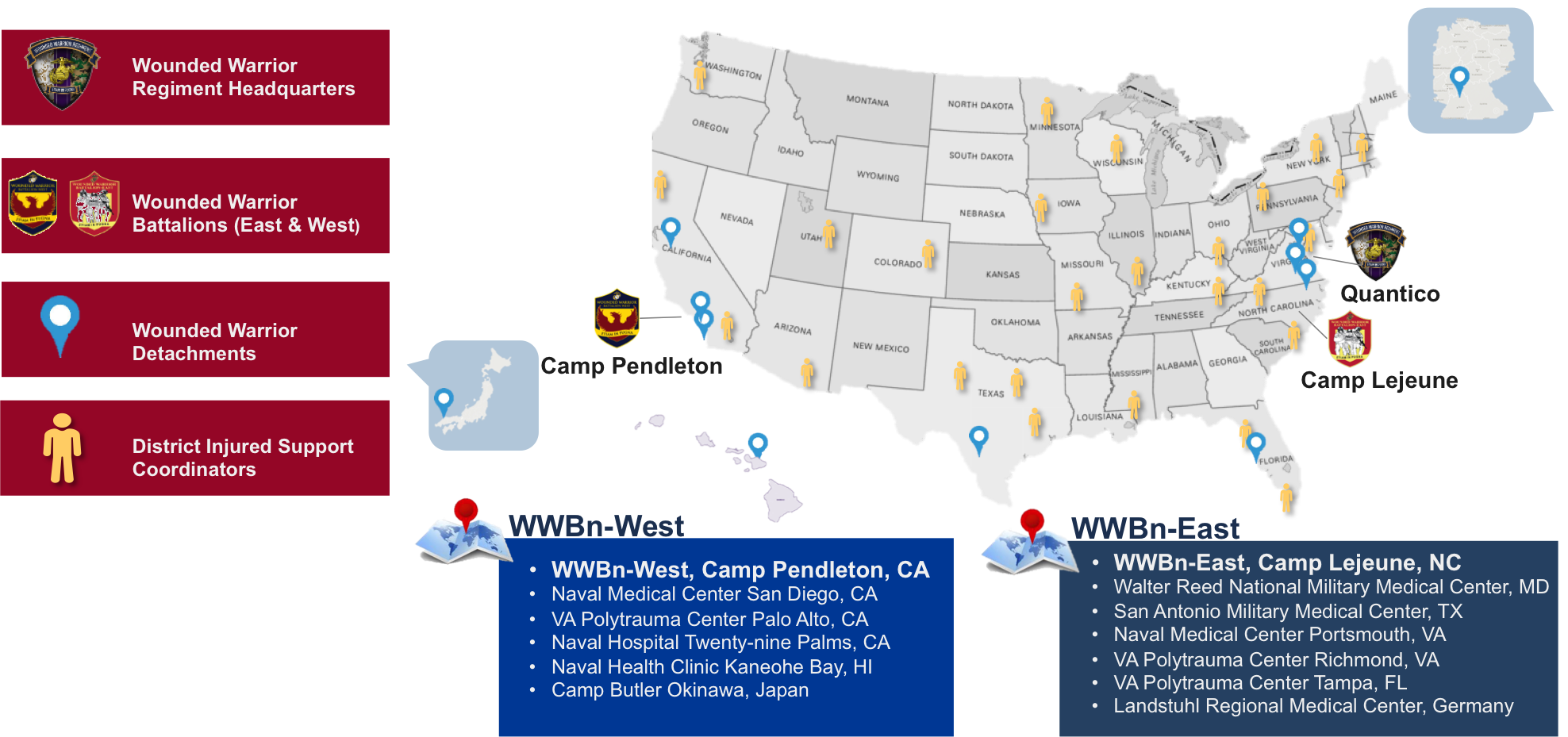 The regimental headquarters, located in Quantico, Virginia, commands the operation of two Wounded Warrior Battalions and multiple detachments in locations around the globe, including major military treatment facilities and Department of Veterans Affairs Polytrauma Rehabilitation Centers. We have Marine leaders standing shoulder-to-shoulder with our warriors and families. Regardless of location, our services are available to the total force – active duty, reserve, and veteran Marines and their families.